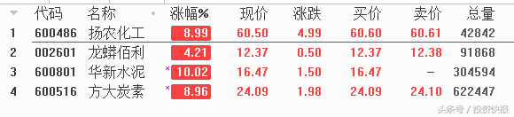 热点挖掘:盘面中,板块呈现普涨格局,其中草甘膦、水泥、钛白粉、化工、石墨烯等涨价类题材所带来的中报业绩预增行情,是今日上涨的主线,且板块中领涨股均为所属行业的龙头企业。比如草甘膦龙头600486杨农化工、钛白粉龙头002601龙蟒佰利、水泥龙头600801新华水泥、石墨烯龙头600516方大炭素等。其上涨逻辑就是产品价格上涨导致主营业务收入增加,从而利润有了保证,同时7月正是中报披露时间,中报确定性行情自然就成了资金追捧的重点。