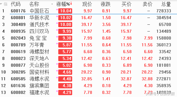 水泥:今日盘面中比较具有板块效应且板块内联动效应较高的就是水泥板块,超3股涨停,多股跟风大涨。(野马策略:epp603)分析其中上涨逻辑为:受错峰生产和环保因素影响,今年以来,水泥行业边际供给继续保持收缩态势,行业水泥库存始终处于低位,至使水泥价格高位震荡。另外,水泥行业销量通常都是下半年要好于上半年,水泥是个高污染行业,在目前环保限产背景下,18年水泥行业利润有望创历史新高。今日收盘后,600801新华水泥公布中期业绩预告,同比增幅超200%,显示行业的盈利水平也是维持高位。今日涨停也是有先知先觉的资金提前介入抢筹。