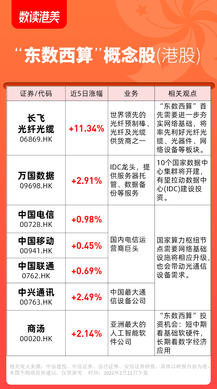 机构预计,“东数西算”工程将每年拉动4000亿元投资。今日(2月21日)市场相关板块集体爆发,Wind东数西算指数暴涨超过9%,港股市场中长飞光纤光缆 $06869.HK 一度涨超6%,一起看看详细概念股名单: