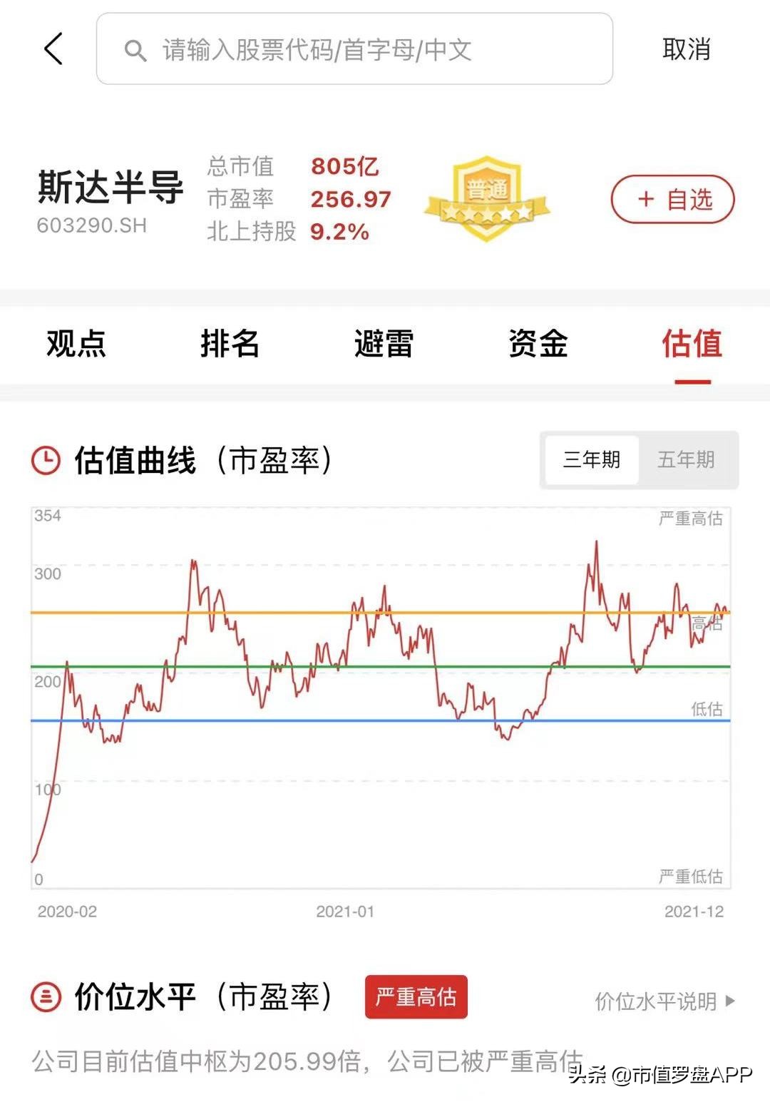 除了高端产品创新力不足之外,根据坊间投资者舆论观察以及结合市值罗盘平台给出的根据市盈率指标绘制的五年期估值参考曲线,公司存在估值偏高的症状。