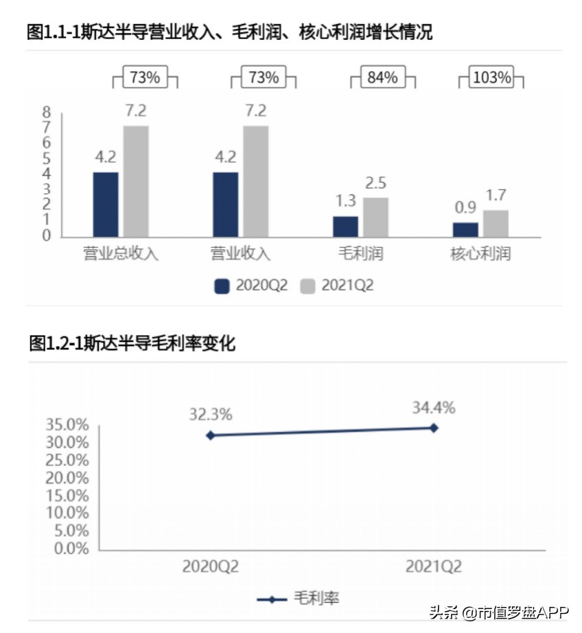 公司披露的2021年半年报显示,斯达半导各项盈利数据表现有些“炸裂”,在A股市场内亮点颇多。营业收入同比增长73%,达到了7.2亿元。而毛利润更是实现了84%的涨幅。整体的毛利率水平也在前值32.3%的不错成绩之上增至34.4%。