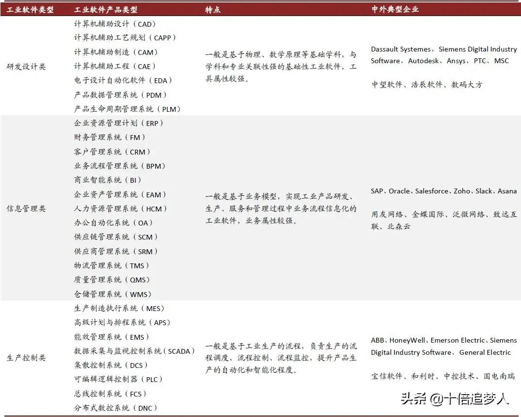 工业软件大致分为设计研发、信息管理、生产控制管理、工业嵌入式软件和工业集成平台五大类,涉及几十个细分门类,不同企业参与不同环节。