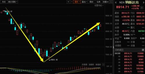 另外再说一下美股,最近美股是真的厉害了,道琼斯指数和纳斯达克指数底部涨幅都超过30%,在K线上是一个巨大的深V。