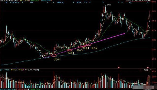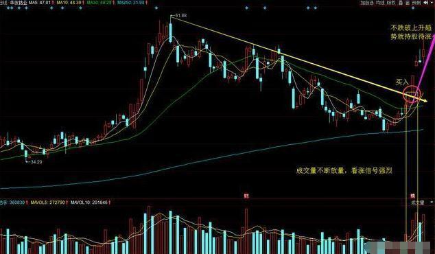 1、股价突破下降趋势线时买入,此时应该轻仓试试水,谨防次日吃个回马枪;值得注意的是突破趋势线时如果伴随成交量不断放大,那么看准信号就更明确;