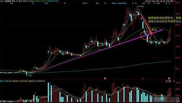 2、股价在上升趋势线上方运行偏离较大时,应当留意K线的形态,如果有形成头部信号,那么即便股价没有回踩趋势线也应该及时抛售,因为趋势线有其僵化的弊端,并不能及时反应行情的转折信号,如果直到股价跌到趋势线再卖的话可能回吐的利润较大。