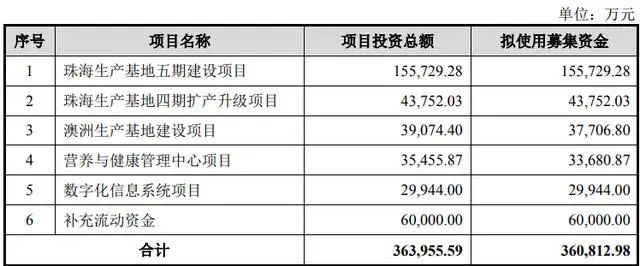 汤臣倍健本次募资主要投向6个项目,分别是珠海生产基地五期建设项目、珠海生产基地四期扩产升级项目、澳洲生产基地建设项目、营养与健康管理中心项目、数字化信息系统项目和补充流动资金。