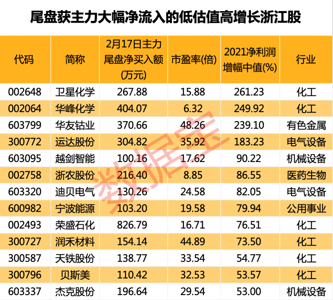 共同富裕示范区的积极影响及带头作用将会持续,上述尾盘主力净流入超100万元的个股中,市盈率低于50倍,且2021年净利润增幅中值超过50%的浙江股仅13只,其中卫星化学、华峰化学、华友钴业等股的2021年净利润有望增超200%;华峰化学、浙农股份的估值低于10倍。