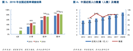而由于我国近视人口在2017年已经达到约6.5亿人,2012年到2017年CAGR为7.63%,根据7.63%的复合增长率来看,预计在2020年我国近视人数可达7.1亿人。此外,从2010年-2018年的数据来看,初中、高中学生的近视率分别维持在70%、80%以上,小学生近视率由2014年的46%下降到36%,6岁儿童的近视率达到约15%。