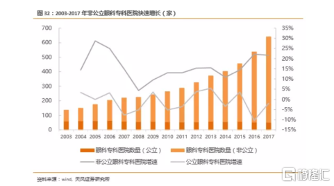 据相关数据显示,2003-2017年期间,眼科专科医院的数量也迎来了快速的发展,其中非公立眼科专科医院数量迎来了比较明显的增长,而公立眼科专科医院数量则减少9家。综合来看,非公立专科眼科医疗机构的发展正在进入黄金成长期。