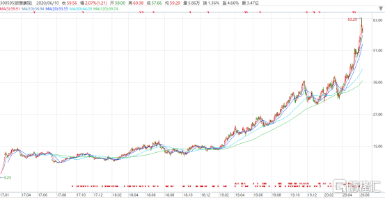 此外,欧普康视股价自2017年上市以来,不到3年的时间股价就翻了20倍。截至10日收盘,其股价报于59.56元,最新总市值为361亿元。