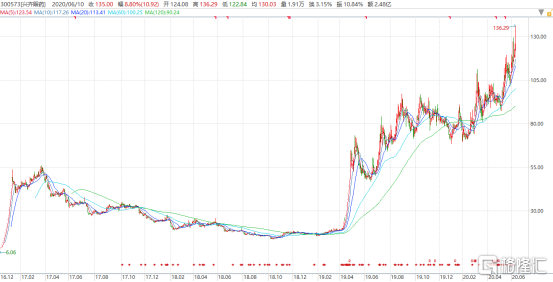 此外,兴齐眼药作为眼科用药的新兴公司,在经历了2018年的业绩下滑后,2019年业绩好转,实现营业收入5.42亿元、净利润0.36亿元,同比增长了25.75%、157%。同时,股价也在2019年掀起一波上涨热潮,自2019年以来累涨708%。截至10日收盘,该股价大涨8.8%至135元,总市值为111亿元。