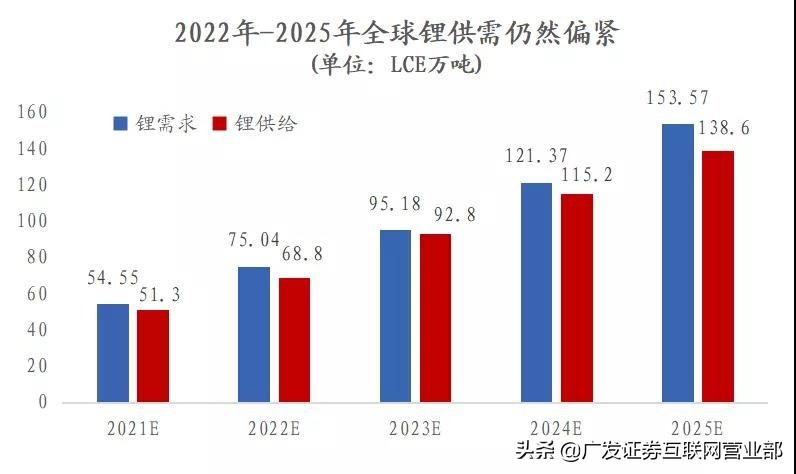 综合来看,预估锂资源供需缺口将进一步拉大,其中2022年上半年将呈现明显偏紧状态。