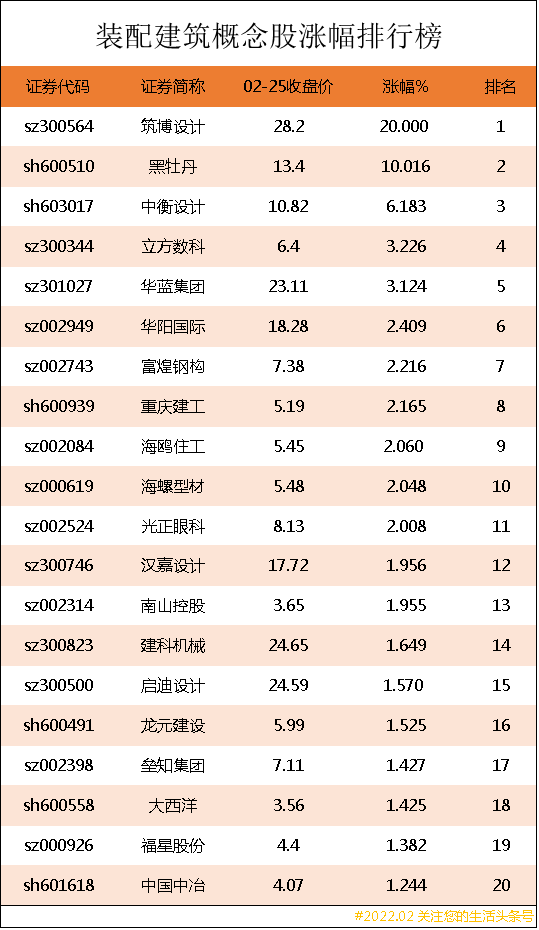 以上就是为读者们带来的装配建筑概念股涨幅排行榜的相关信息,本文是根据有关数据及近期事件所撰写分析文章,并不构成投资建议,据此操作,风险自担!(本文属于非商业性文章)