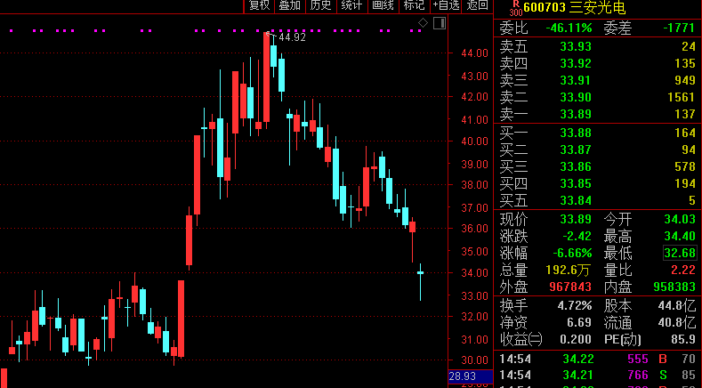 消息发出后,三安光电应声下跌,9月1日跌幅达6.66%,市值蒸发超百亿,截至收盘股价为33.89元/股,最新市值已跌破1600亿元。