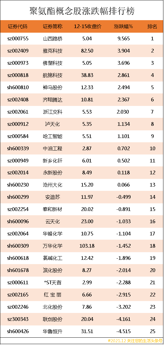 以上就是为读者们带来的聚氨酯概念股涨跌幅排行榜的相关信息,本文是根据有关数据及近期事件所撰写分析文章,并不构成投资建议,据此操作,风险自担!(本文属于非商业性文章)