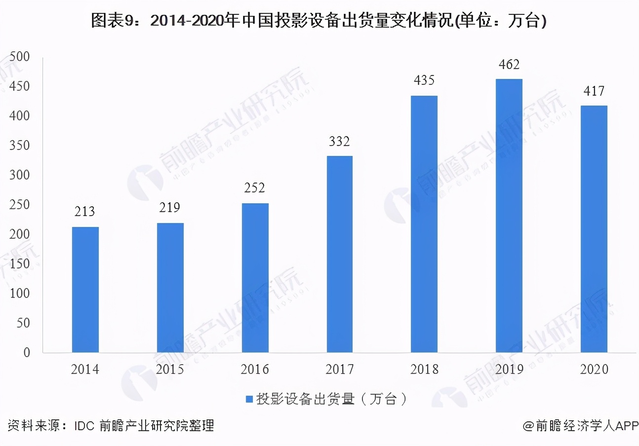 2020年,受全球新冠肺炎疫情影响,我国投影设备出货量小幅下降至417万台。