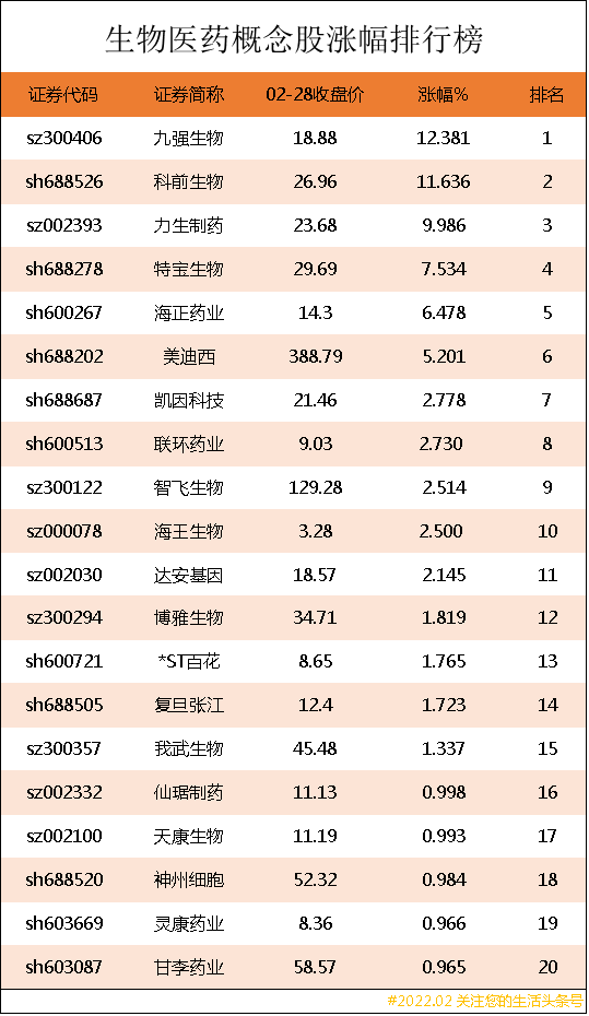 生物医药概念股涨幅排行榜