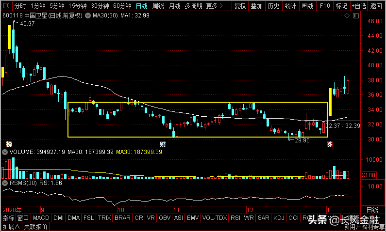 中国卫星最近也突破了底部盘整区域,同时在突破涨停K线上半部分强势整理。