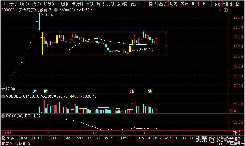 中天火箭在打开连板后出现了一波比较明显的回调行情,不过目前价格已经脱离了之前的下降趋势,形成了一个比较明显的横盘区间,关注后续价格能否有效突破盘整。