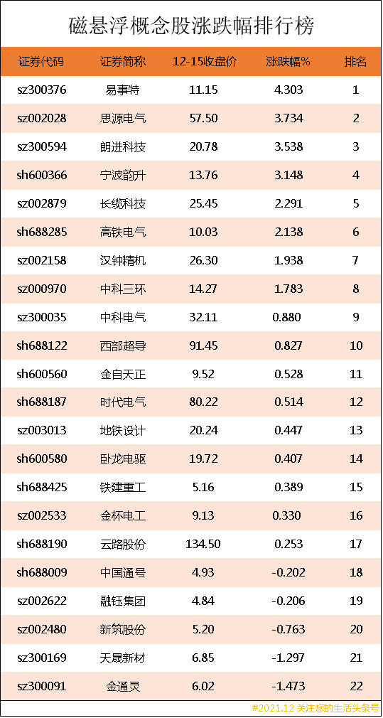 以上就是为读者们带来的磁悬浮概念股涨跌幅排行榜的相关信息,本文是根据有关数据及近期事件所撰写分析文章,并不构成投资建议,据此操作,风险自担!(本文属于非商业性文章)