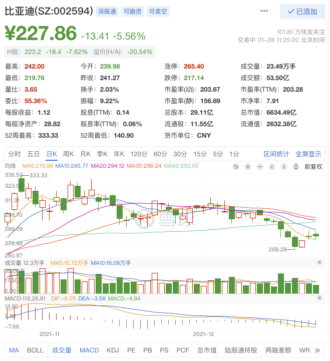 1月28日消息,A股盘中,新能源汽车龙头比亚迪盘中大跌超8%报219.76元/股,总市值跌破6400亿元。