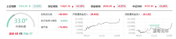 截至收盘,沪指跌0.10%,报收3363点;深成指涨0.10%,报收13421点;创业板指涨0.81%,报收2656点。沪股通净流入29.98亿,深股通净流入19.12亿。