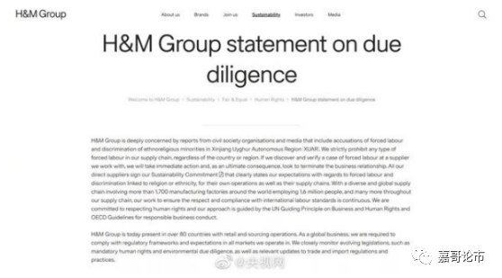 H&M在声明中写道:H&M集团对来自民间社会组织的报告和媒体的报道深表关注,其中包括对新疆维吾尔自治区少数民族强迫劳动和宗教歧视的指控。声明中,H&M集团表示,我们不与位于新疆的任何服装制造工厂合作,也不从该地区采购产品/原材料。
