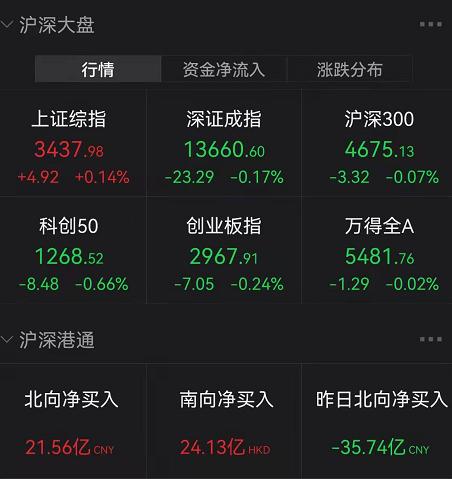冲高回落。今天的早盘,A股虽然整体涨多跌少,但尾盘创业板和深证指数又翻绿了。不过,北向资金则净买入超20亿元。