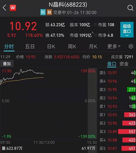 今天,光伏组件龙头晶科能源登陆科创板,盘中一度较发行价涨幅121%,触发临停。收涨118.4%,最新股价10.92元每股,市值超1000亿元。