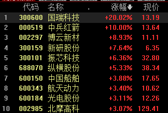 8月13日,军工股早盘走强,截至发稿,国瑞科技、中兵红箭涨停,博云新材涨近9%,新研股份、振芯科技、航天动力等纷纷跟涨。