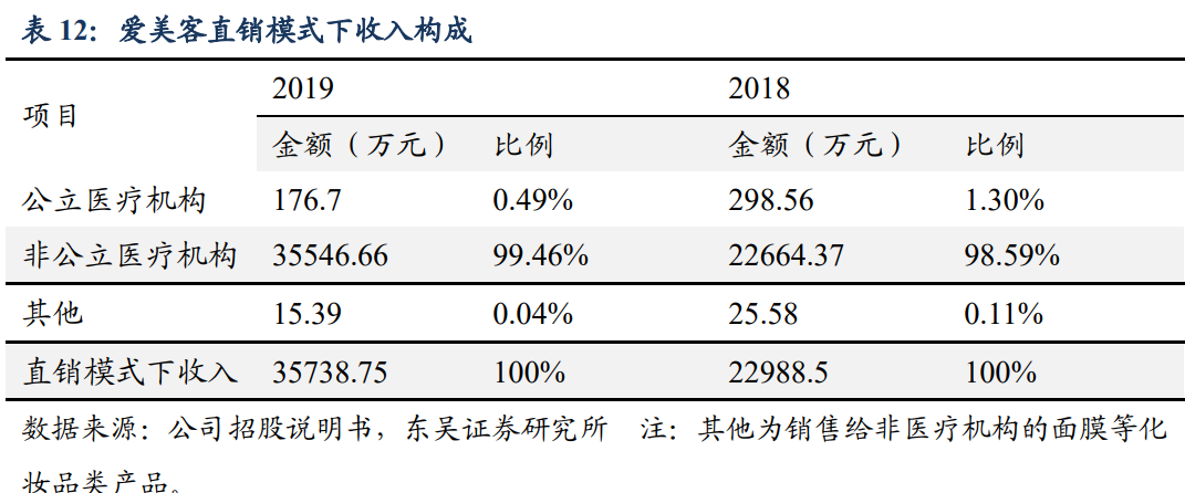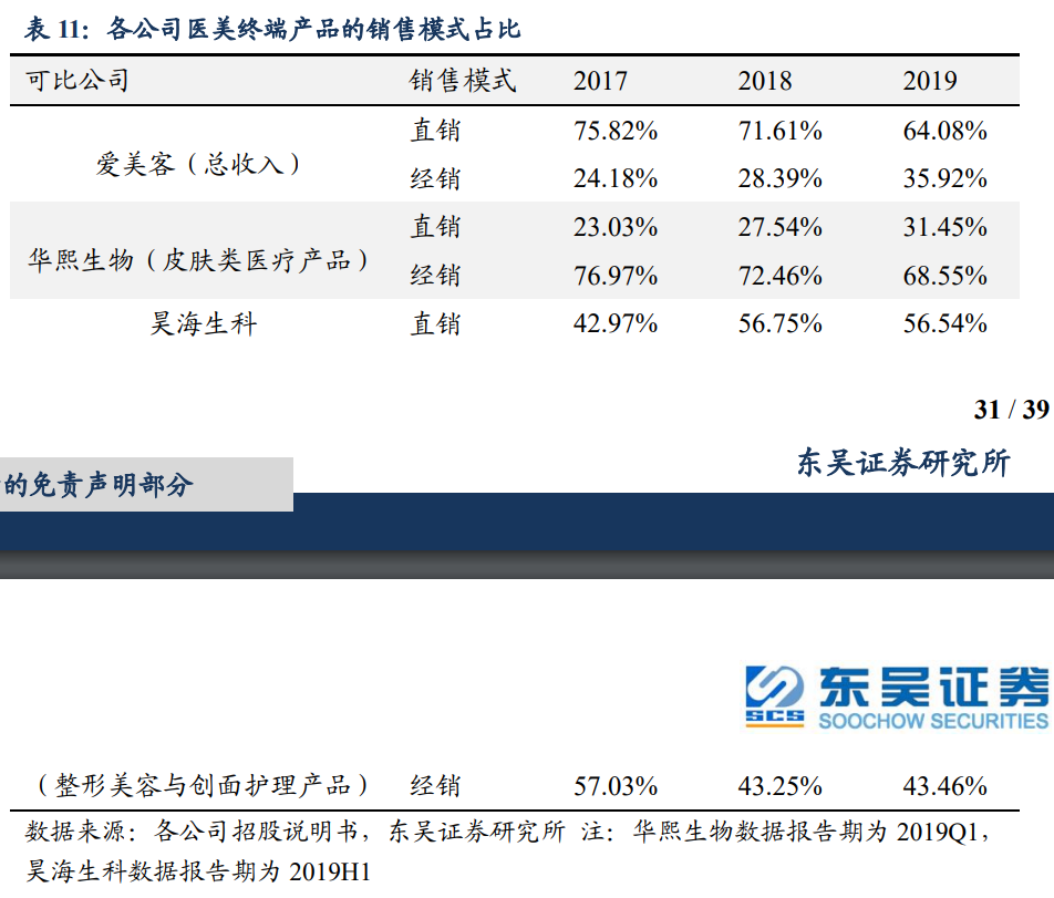 3. 销售模式:爱美客直销比例最高,在医美行业销售规模领先