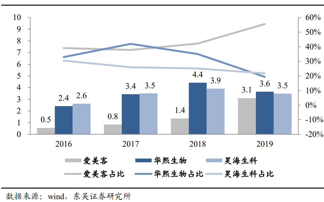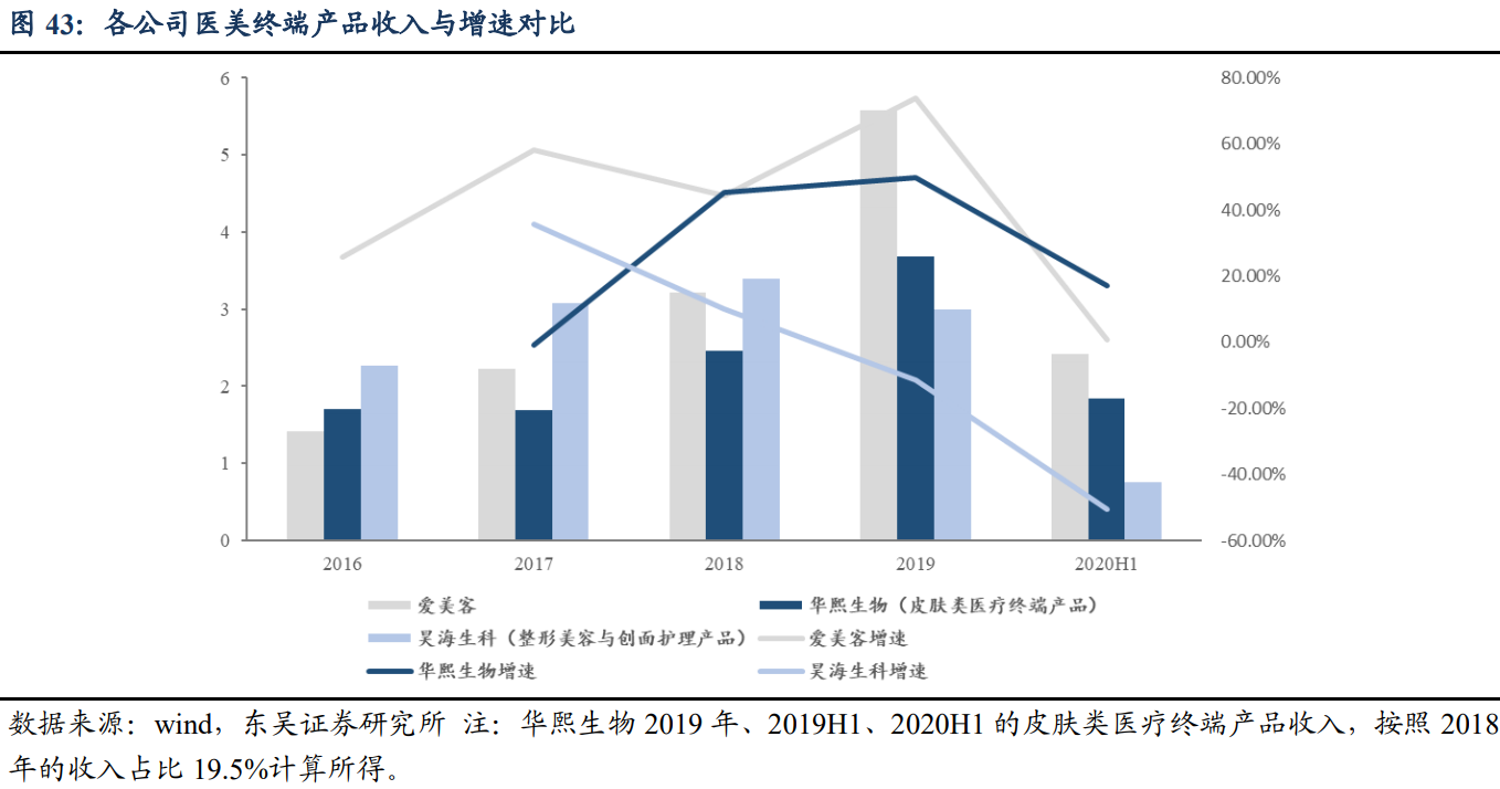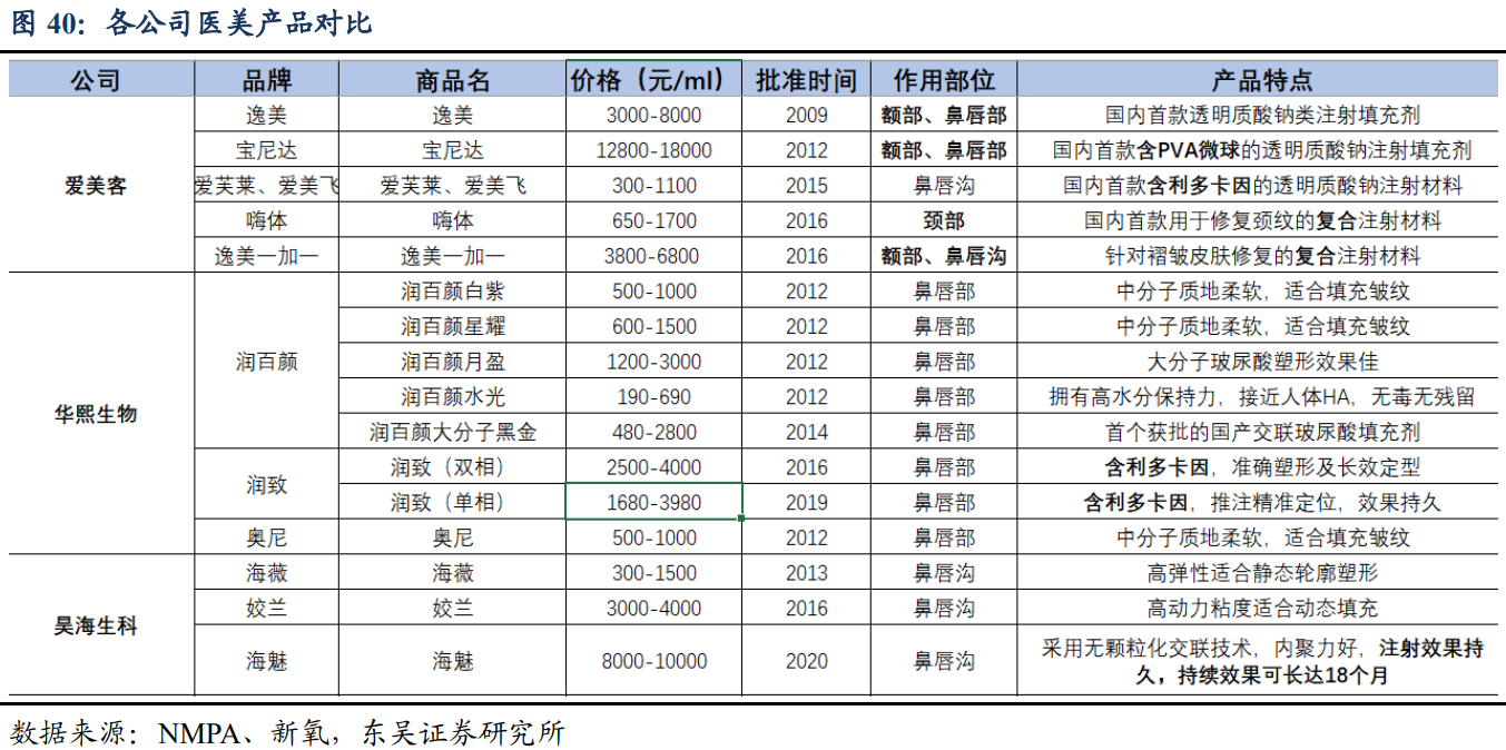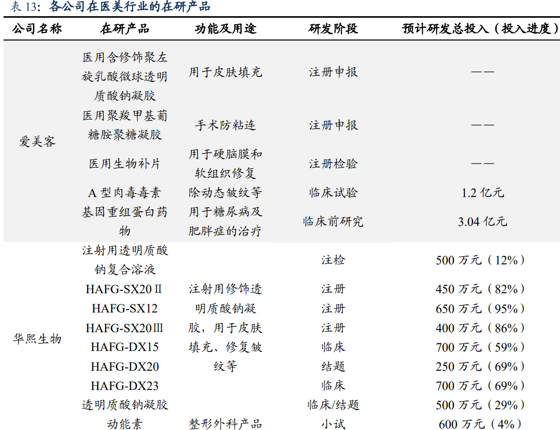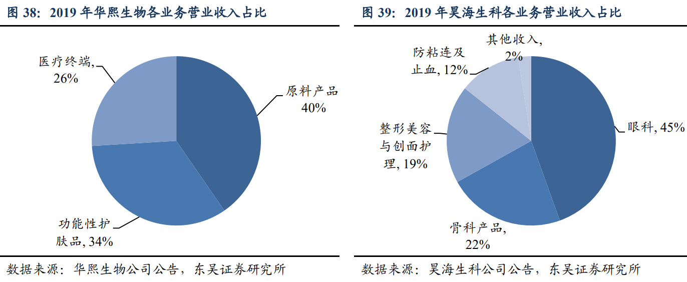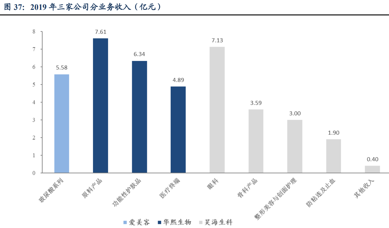 整体来看,三家公司主营业务均涉及透明质酸,爱美客上市产品与在研产品线集中 在医美终端产品。华熙生物主营业务包括透明质酸原料、医疗终端产品、功能性护肤产 品等三大类,原料产品和功能性护肤品的收入占比分别约 40%、34%。昊海生科的整形 美容与创面护理产品包括玻尿酸填充剂与重组人表皮因子,收入占比约 19%。2019 年, 在医美终端产品方面,爱美客收入为 5.58 亿元,大于华熙生物和昊海生科。