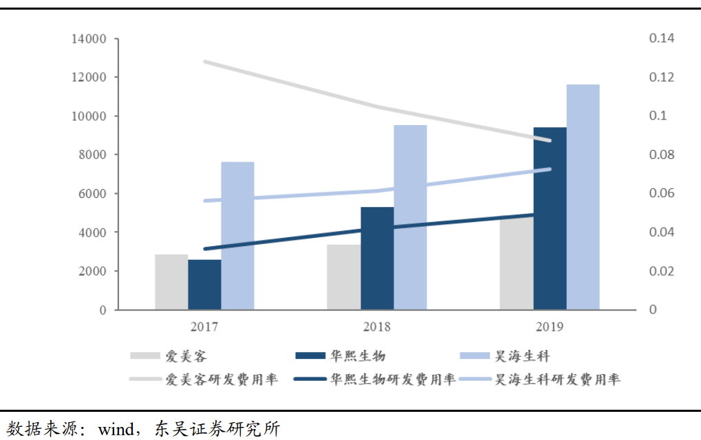 爱美客研发费用率最高。产品更新迭代是公司长期可持续发展的重要支撑,爱美客、 华熙生物和昊海生科作为创新型企业,不断加大研发费用的投入,2019 年爱美客、华熙 生物、昊海生科的研发费用分别为 4856 万元、9389 万元、1.16 亿元,分别同比增长 44.2%、 77.6%、21.7%。相比之下,爱美客的研发费用率最高;研发费用率逐年降低,主要由于 爱美客的营收增速快,营收规模不断增大。