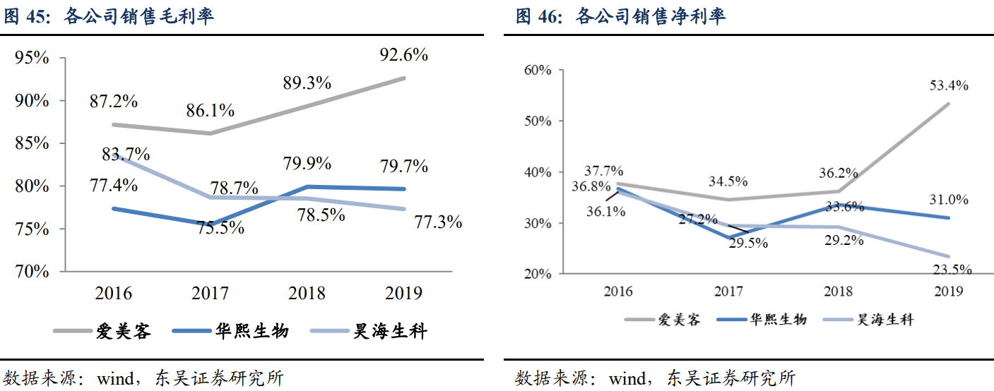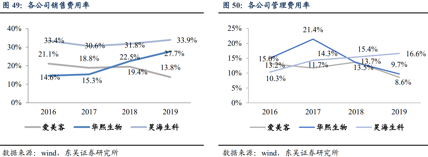 爱美客的销售费用率、管理费用率相对较低。2019 年,爱美客、华熙生物和昊海 生科销售费用分别为 0.77 亿元/5.21 亿元/5.44 亿元,销售费用率分别为 13.8%、27.7% 和 33.9%。爱美客费用率远远较低,主要由于产品结构、销售模式和客户群体上的差异。