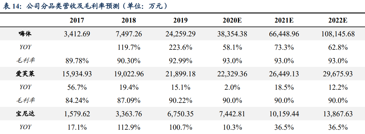 1、“嗨体”是国内目前唯一获得国家药监局批准的专门用于颈部皱纹修复产品,市 场需求旺盛,产品处于快速上升阶段。假设 2020-2022 年销量分别增长 55%/65%/55%; 出厂价逐年上升,分别为 359.66/377.65/396.53 元/支;毛利率保持在 93%。