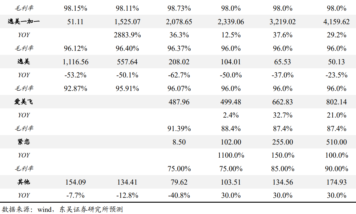 5、“逸美”收入连续下滑,主要由于公司于 17 年推出该系列升级版产品逸美一加 一 , 预 计 未 来 逸 美 销 售 规 模 将 继 续 下 滑 , 假 设 2020-2022 年 销 量 同 比 变 化 -45.0%/-30.0%/-15.0%;出厂价分别为 630.37/567.33/510.60 元/支; 毛利率保持在 96%。