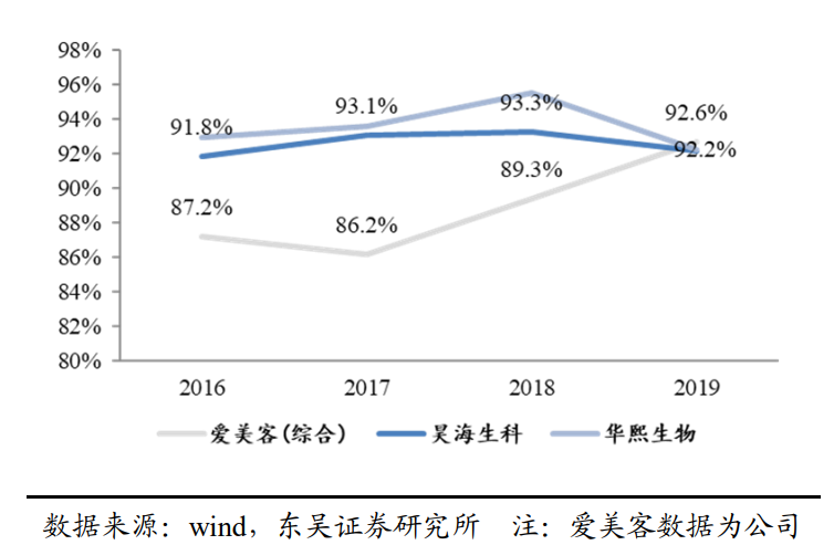 爱美客毛利率和净利率最高。2017-2019 年,爱美客的综合毛利率持续上升,并且 一直高于华熙生物和昊海生科。主要由于爱美客聚焦医美终端产品,具备明显的高毛利 率特征,而华熙生物和昊海生科由于其他业务占比高,拉低了其总毛利率水平。从三家 公司的同类产品毛利率来看,华熙生物(注射用透明质酸钠凝胶)、昊海生科(玻尿酸) 的毛利率均高于 90%;爱美客 2019 年 5 款玻尿酸填充剂的毛利率均高于 90%,综合毛 利率 92.63%。随着高毛利产品销售占比增加,产品价格逐步稳定,同时生产规模扩大 及原材料价格下降导致的生产成本下降,爱美客的综合毛利率持续上升。