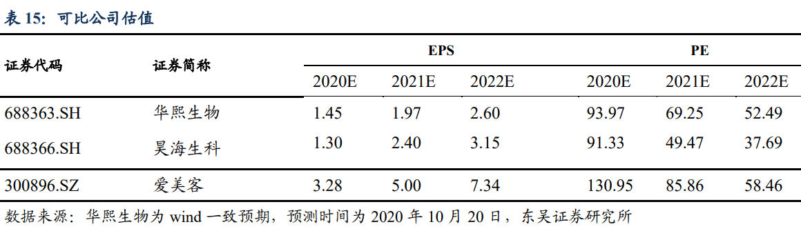 参考可比公司华熙生物与昊海生科,爱美客的估值相对较高。一方面,由于公司作 为新股,另一方面,公司更加聚焦于医美行业,建立起牢固的竞争优势,未来有望继续 推出多个重磅产品,推动公司业绩快速增长。