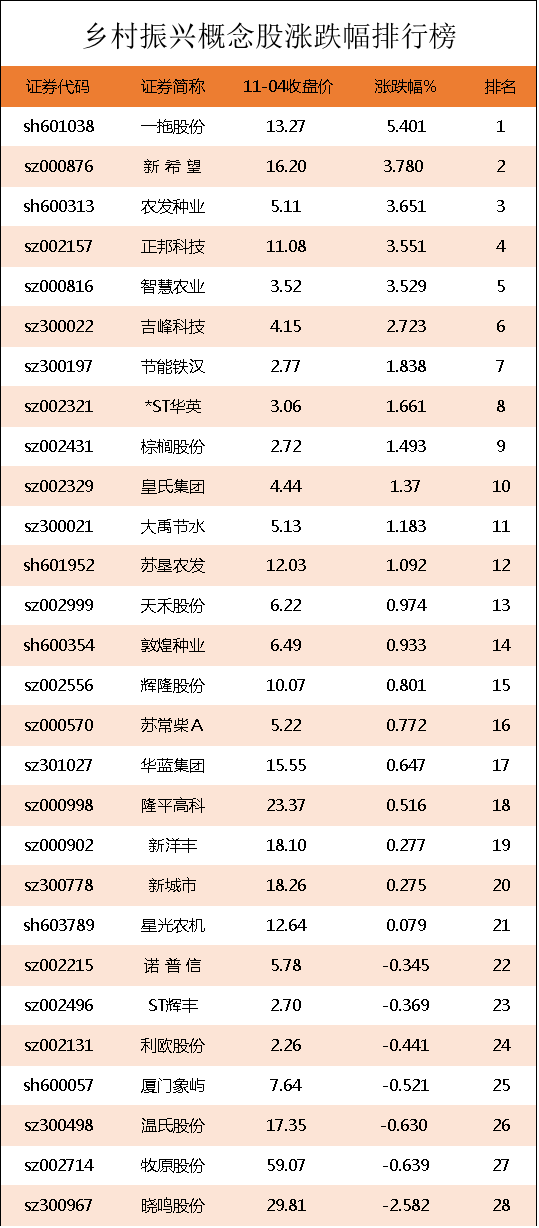 乡村振兴概念股涨跌幅排行榜