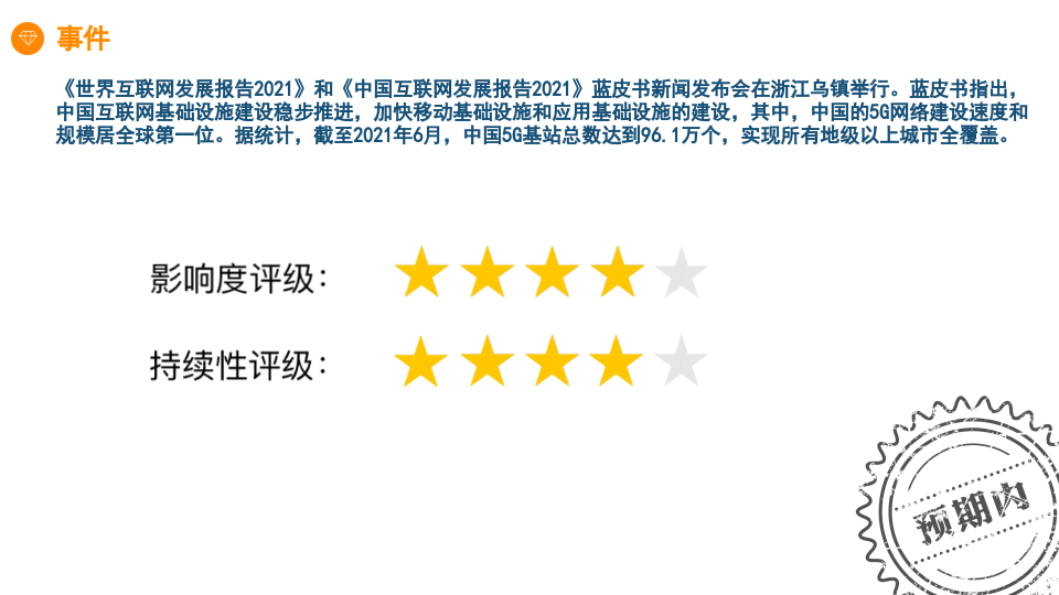 首页[002281光迅科技(22.94,2.41%,15.50):中国5G网络建设速度和规模全球第一,5G光模块龙头未来可期]《世界互联网发展报告2021》和《中国互联网发展报告2021》蓝皮书新闻发布会在浙江乌镇举行。蓝皮书指出,中国互联网基础设施建设稳步推进,加快移动基础设施和应用基础设施的建设,其中,中国的5G网络建设速度和规模居全球第一位。据统计,截至2021年6月,中国5G基站总数达到96.1万个,实现所有地级以上城市全覆盖。该事件已在市场预期之内。