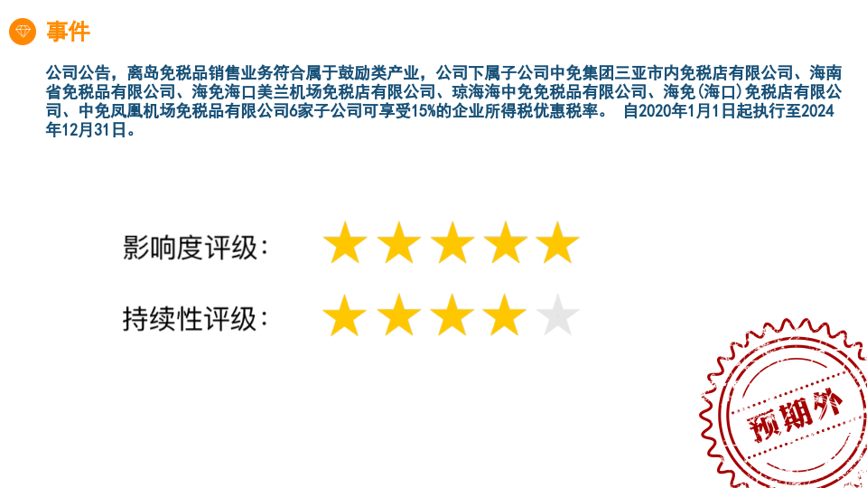 公司公告,离岛免税品销售业务符合属于鼓励类产业,公司下属子公司中免集团三亚市内免税店有限公司等6家子公司可享受15%的企业所得税优惠税率。自2020年1月1日起执行至2024年12月31日。该事件在市场预期之外。公司属于巨盘股、成长股、价值股,相对适合稳健型基本面投