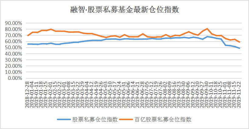 从仓位指数来看,私募年底延续减仓动作,股票策略私募与百亿股票策略私募仓位指数再度下滑,仅为48.78%和58.81%,双双再创年内新低。对于私募持续减仓的动作,除了部分是谨慎看待年底行情外,也不乏部分私募年内已经获得较高收益,在完成盈利目标之后选择卖出落袋为安,也有部分私募在高位卖出,便于逢低布局2020年行情。