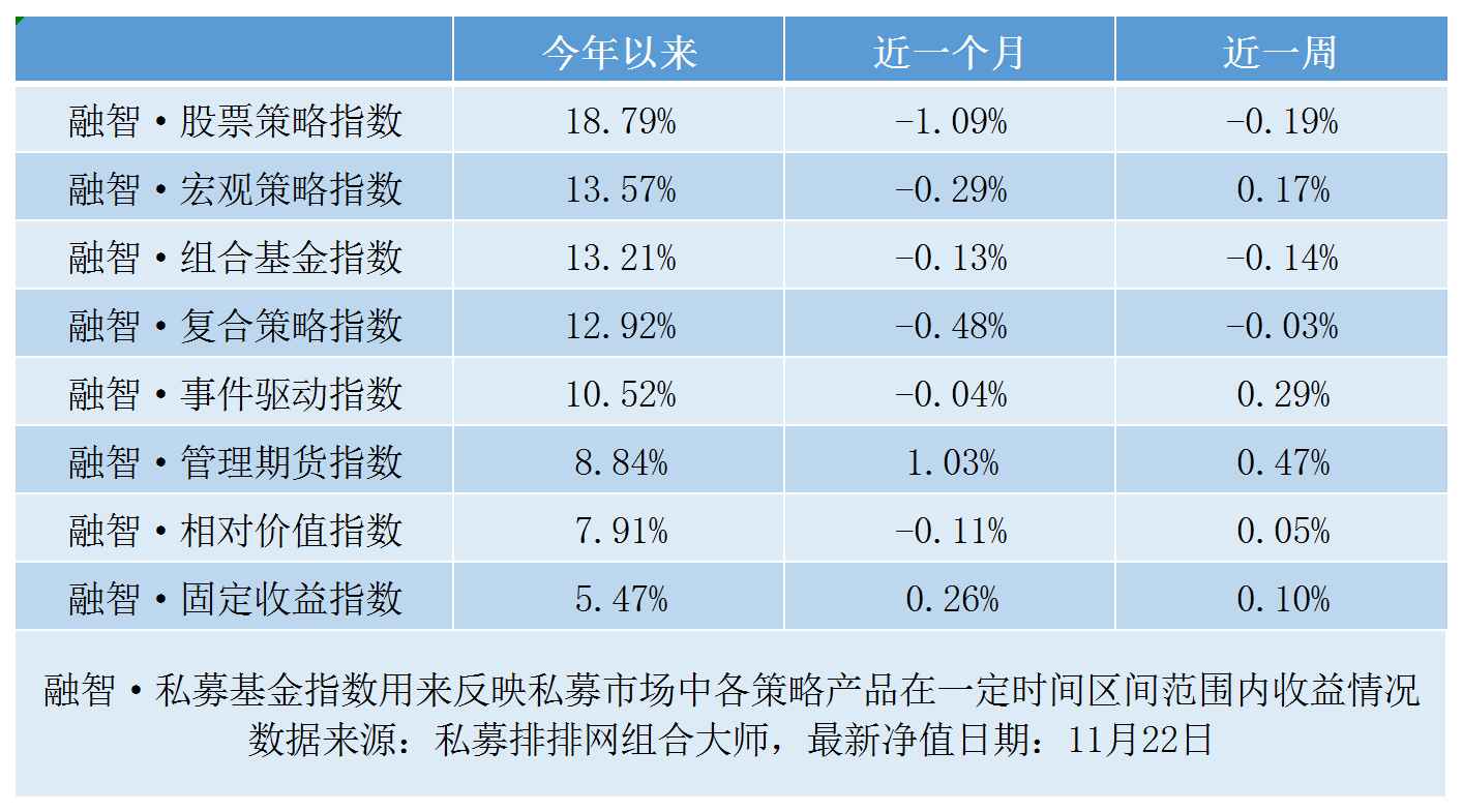 从融智·私募基金指数表现来看,私募基金收益,尤其是股票策略基金与组合基金受股市波动影响较大,管理期货策略继续延续正收益,采取量化交易模式的期货产品由于抓住了市场上的窄幅振荡机会,今年收益更佳。管理期货策略也是除了固定收益外,近一周、近一个月均取得正收益的投资策略。