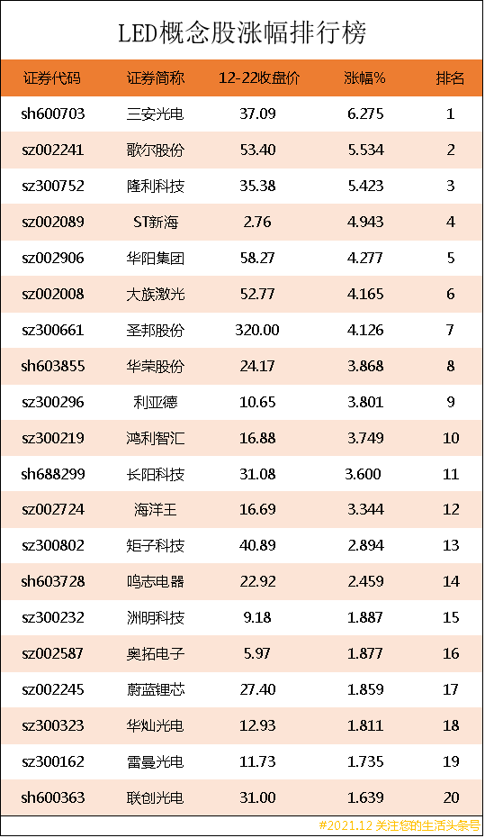 以上就是为读者们带来的LED概念股涨幅排行榜的相关信息,本文是根据有关数据及近期事件所撰写分析文章,并不构成投资建议,据此操作,风险自担!(本文属于非商业性文章)
