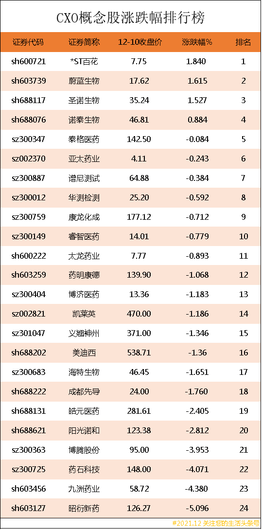 以上就是为读者们带来的CXO概念股涨跌幅排行榜的相关信息,本文是根据有关数据及近期事件所撰写分析文章,并不构成投资建议,据此操作,风险自担!(本文属于非商业性文章)