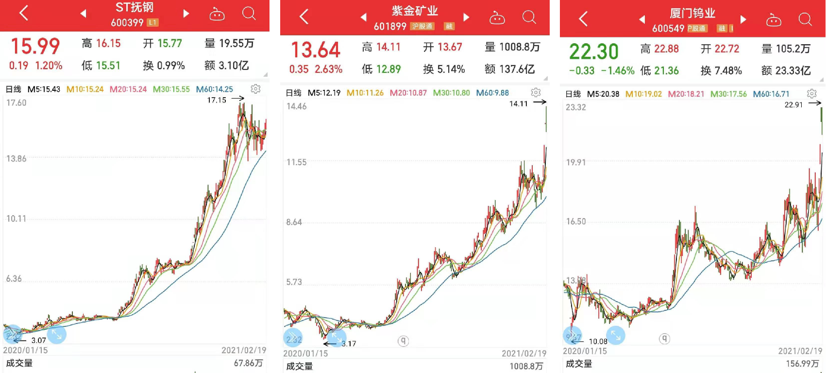 第一,2021开年来股价涨跌情况:28只股价上涨、19只股价涨幅超10%【11只股价涨幅超30%,依次是盛和资源、中信特钢、北方稀土、西部矿业、紫金矿业、锡业股份、江西铜业、天齐锂业、华友钴业、久立特材、厦门钨业】,7只股价下跌【宝钛股份、永兴材料2只股价跌幅超10%,2只2020年股价涨幅均超100%】