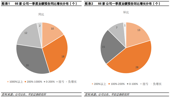 平安证券认为相较于去年低基数对同比的影响较大,环比数据比同比数据对判断化工行业的景气度更有意义。环比来看,化工行业的业绩增速环比继续增长。环比增速200%以上、100-200%、0-100%、环比扭亏、环比负增长的企业占比分别为20%、44%、23%、11%、2%。当前节点来看,基于66家公司预报的业绩环比数据,98%的公司业绩预喜,平安证券认为化工行业的一季度大概率存在较多的亮点。