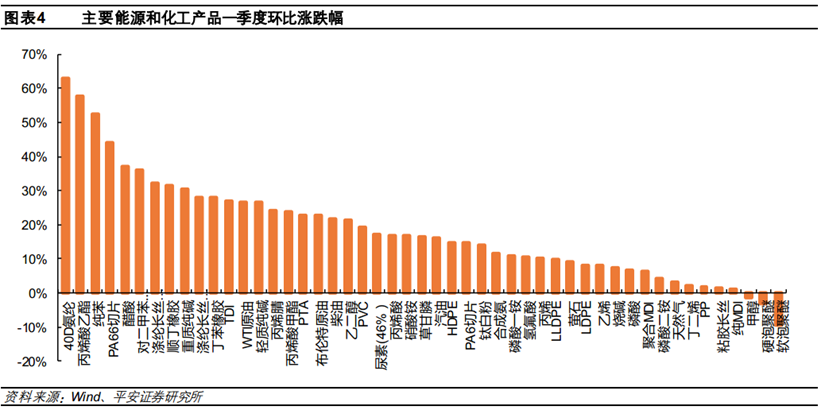能源和化工产品价格持续回升。能源和化工产品价格自2020年3-4月份进入低谷,随后在原油价格的支撑下震荡上行,截止一季度末,能化产品的价格上行动力依然较为充足。下图展示了主要能化产品一季度价格环比的涨跌幅度。除了原油成本面的支撑之外,需求的旺盛、部分产品海外供给端收缩、国内外不可抗力等因素,也是此轮价格上涨的重要推手。