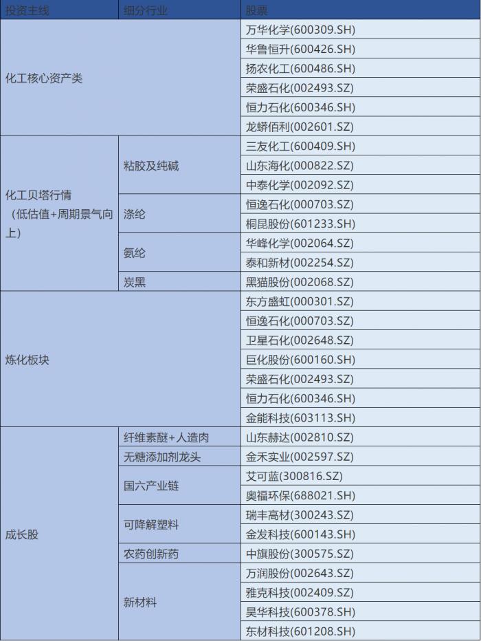 l 化工核心资产类已调整至估值合理水平,建议逐步配臵,中长期看这个位置只输时间不输空间。国盛证券认为龙头公司高溢价的状态未来还会长期持续,而高溢价的方向应该给到未来最确定、壁垒和竞争力最强的核心龙头,继续看好万华化学(600309.SH)等优质公司。