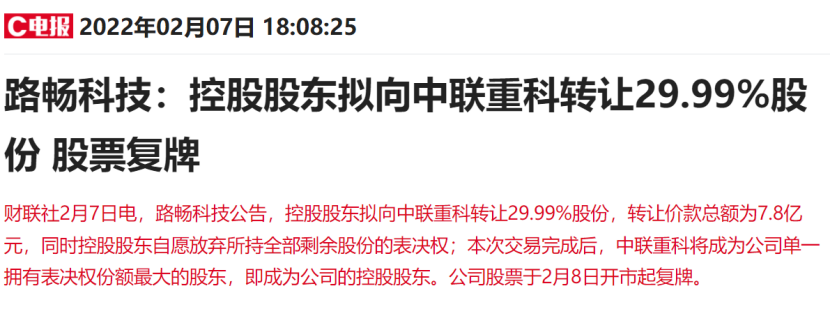 财联社(上海,编辑 陈丽红)讯,今日晚间,中联重科发布公告称,拟收购路畅科技29.99%股份,成为公司控股股东。